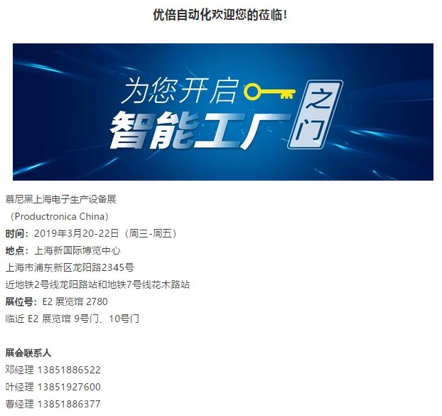 Productronica China特約展商南京優倍自動化系統有限公司(簡稱:優倍自動化)以“電子產線MES與裝備集”成為展示主線,基于智能制造,啟用大型電子看板、軟件使用體驗、現場問答、案例回顧解析等方式,向來賓全面展示優倍MES V2.0系統版本所具備的八大功能模塊:物料管理、產品工藝、生產管理、質量管理、設備管理、可視化管理、信息集成、系統管理。